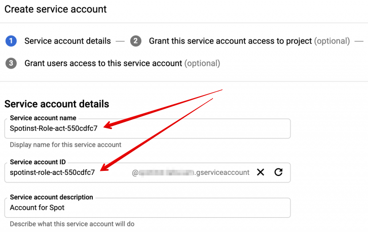In GCP, paste the name into the Service Account Name and Service Account ID fields. Click Create.
