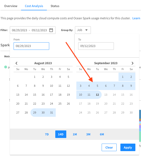 The top part of the cost analysis page is a bar chart showing your Spark application usage metrics on the cluster over time.