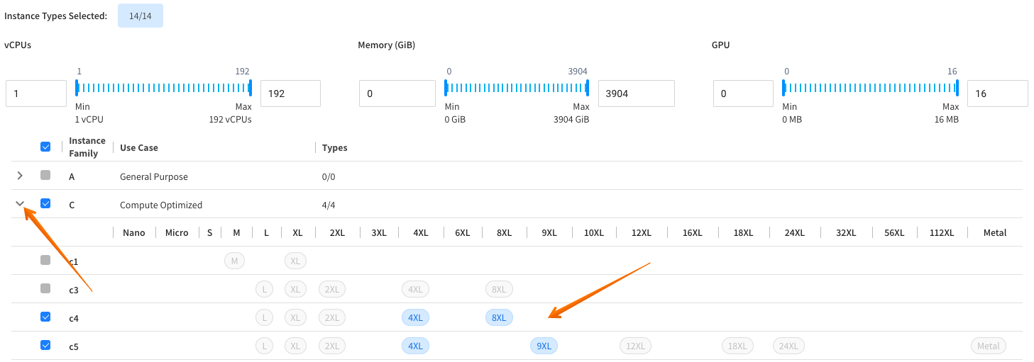 Above the sliders, Instance Types Selected indicates how many of the available instances you have marked (specifically: number of instances marked/number of instances available). This figure changes automatically when you move the sliders or when click or unclick instances. There are similar indicators in the Types column. For example, the illustration above shows that you have marked two Compute Optimized instances out of four that are available.
