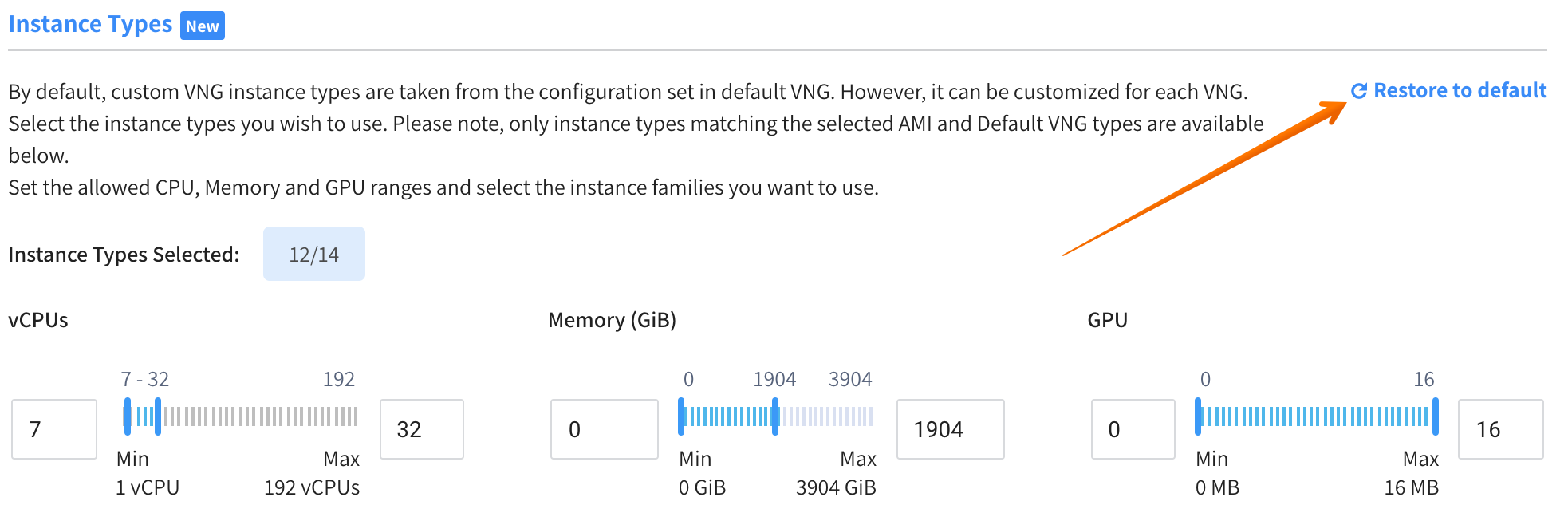 To restore the instance types in a VNG to the default configuration, click Restore to Default. This behaves as follows: