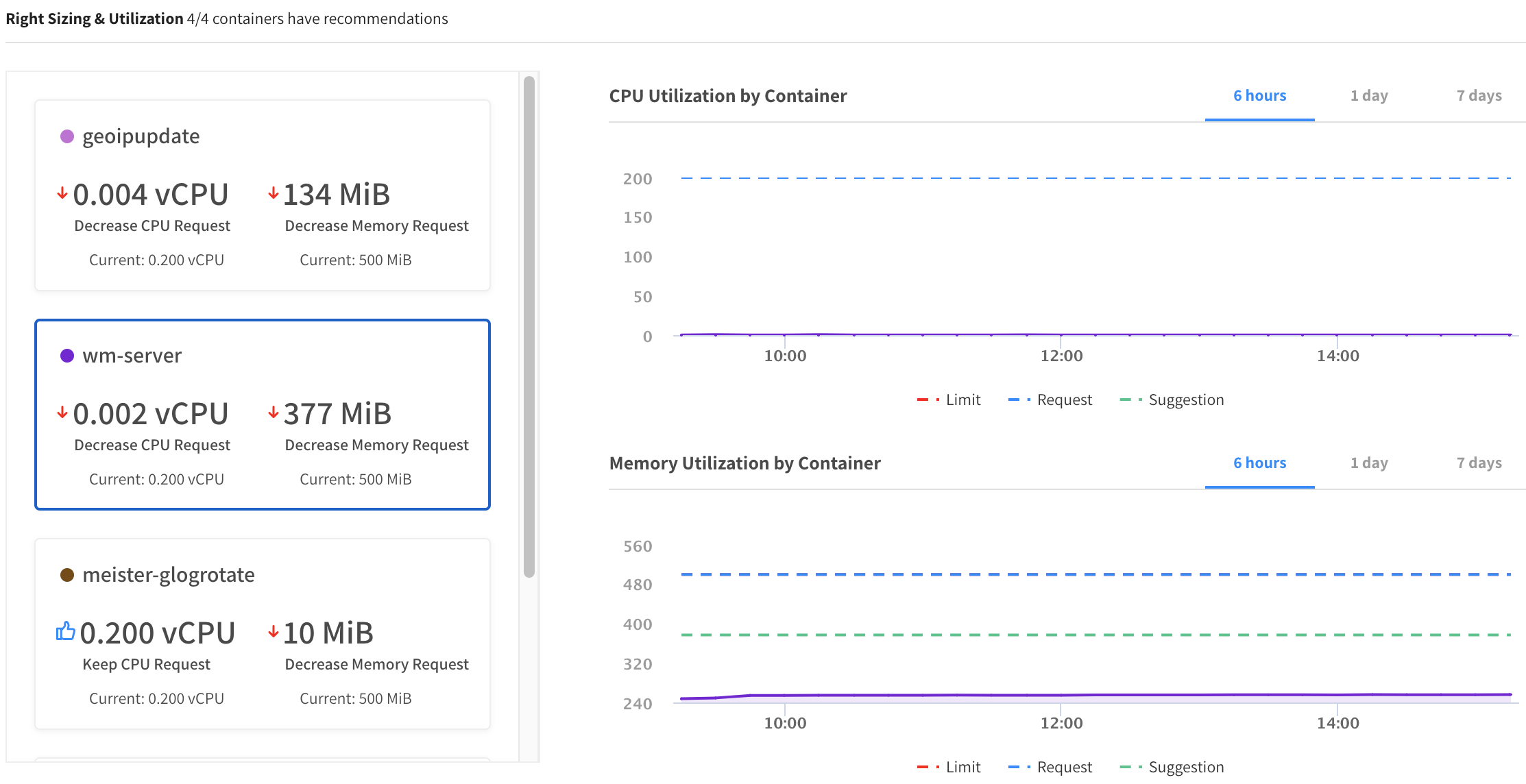 The CPU and memory utilization charts for that resource appears on the right. If the deployment shows recommendations for multiple containers, click on the container to see the relevant charts.