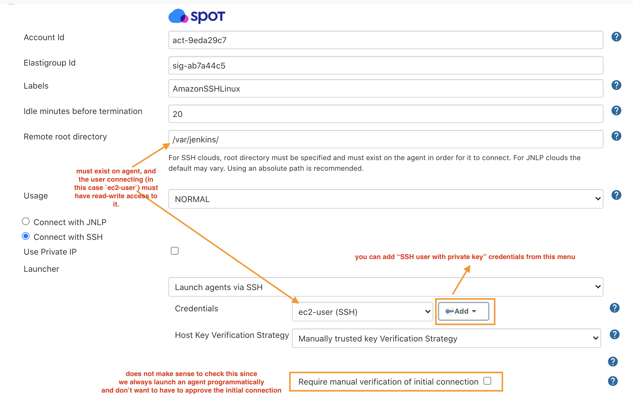 The Spot Jenkins plugin supports connecting agents to the controller using the two most common methods: